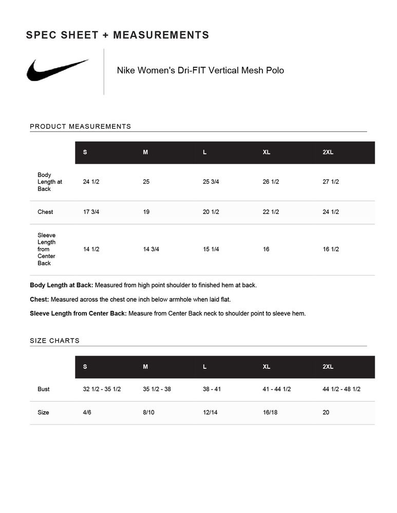 Designed for the ultimate in performance, this polo has a soft drape and a vertical mesh texture. Dri-FIT moisture management technology provides breathable comfort during and after play. Tailored for a feminine fit with a Johnny collar. A contrast Swoosh design trademark is embroidered on the left hem. Made of 4.4-ounce, 100% polyester Dri-FIT fabric.